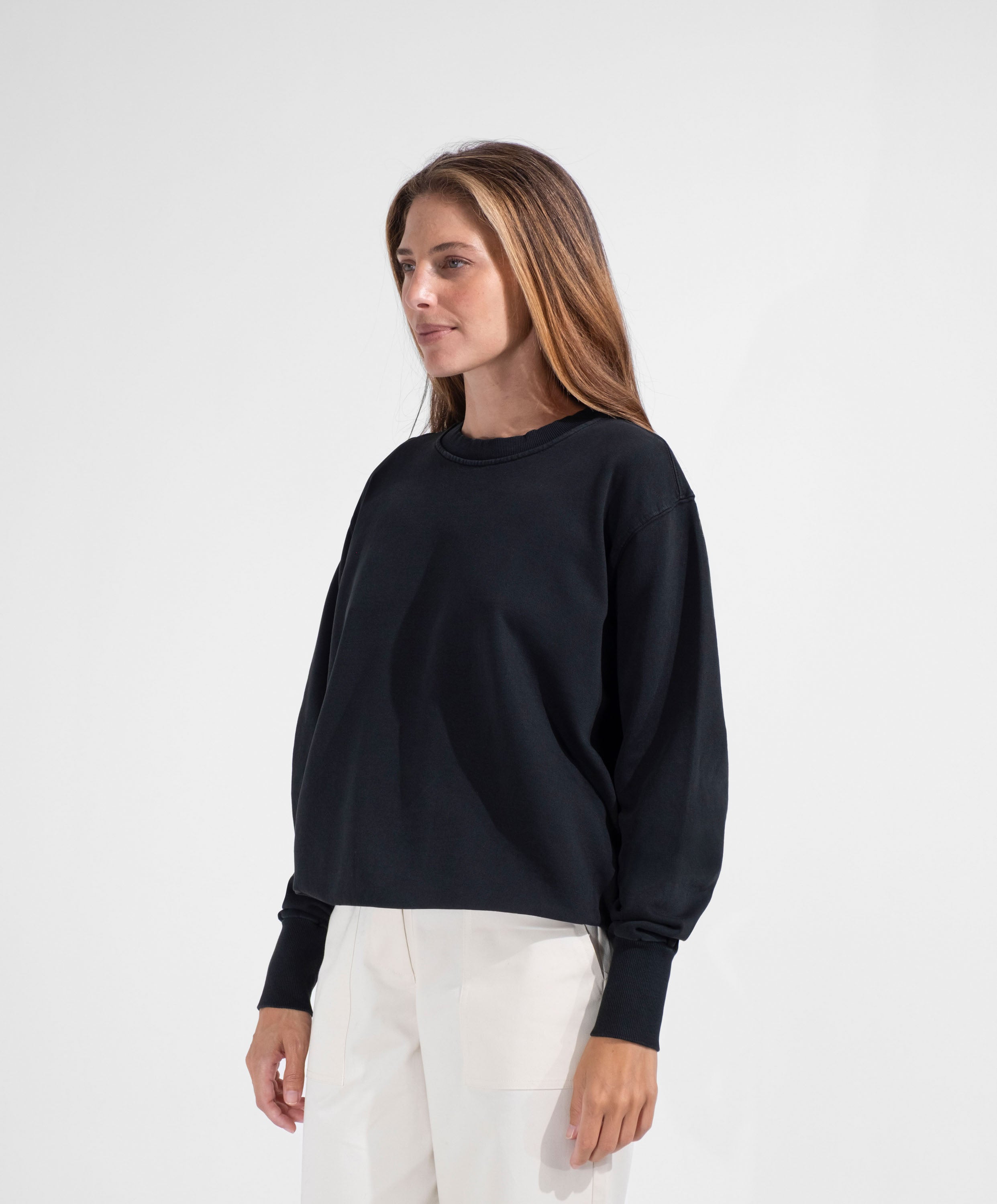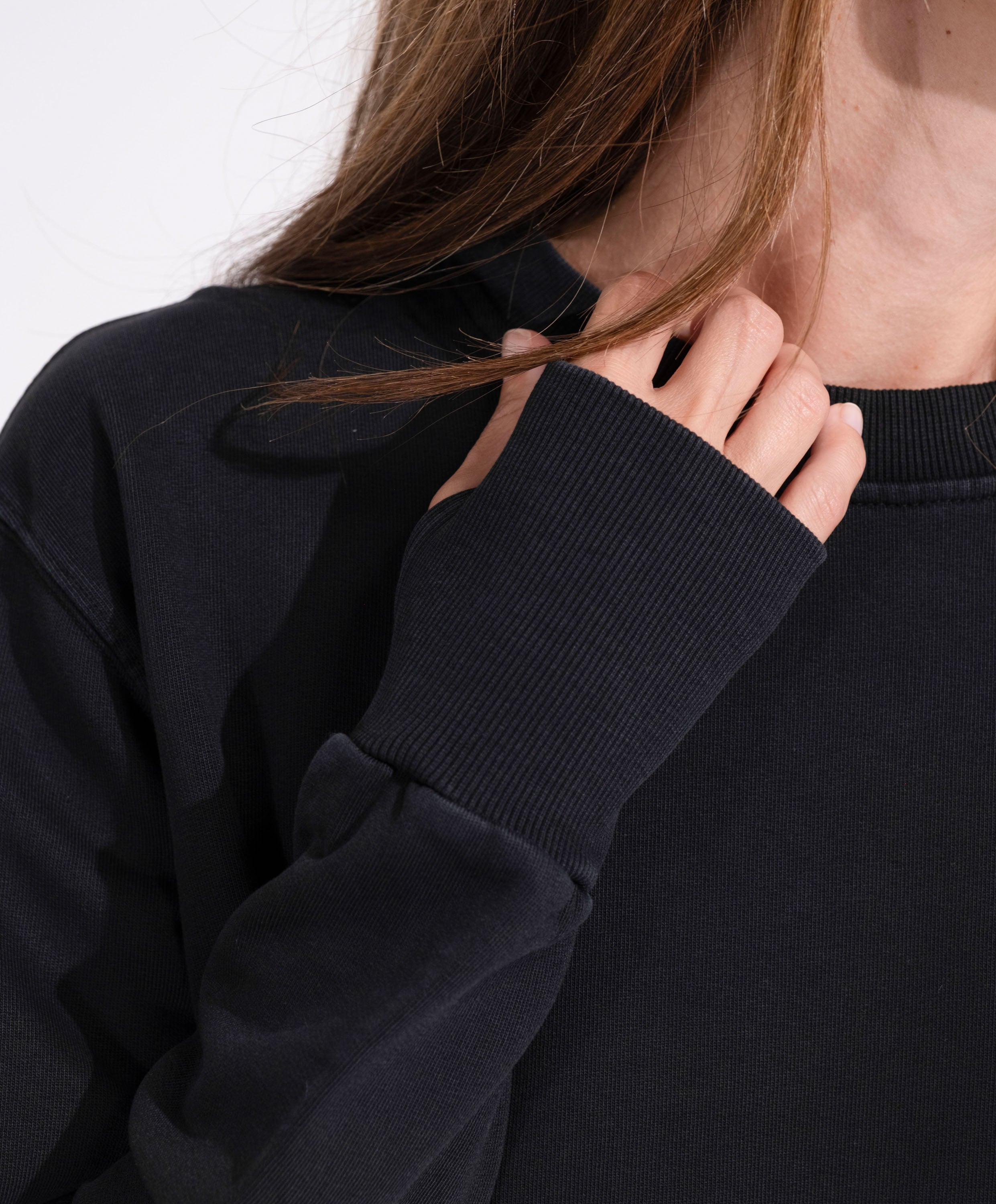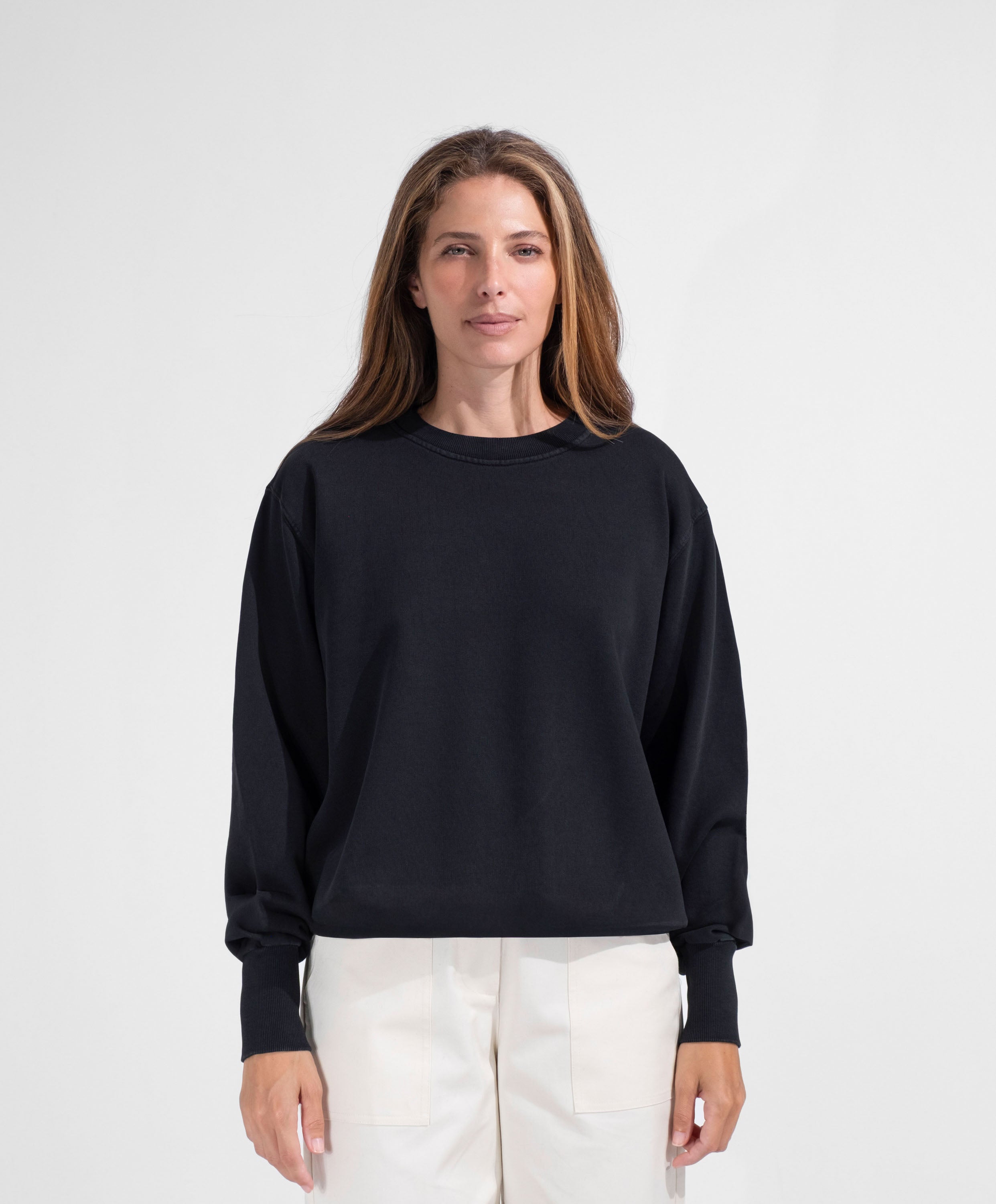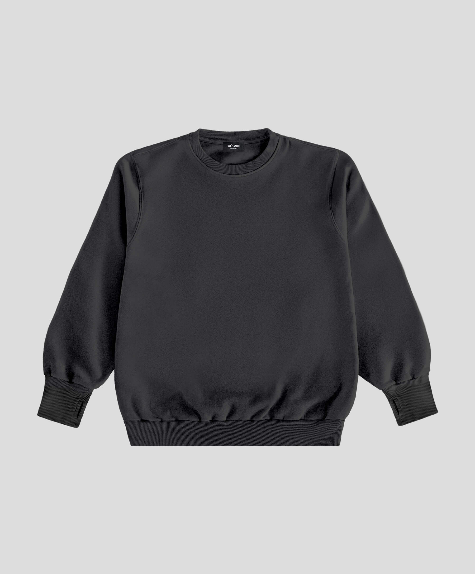 Felpa girocollo, tinto in capo, vestibilità over, polsini dotati di passapollice, 100% cotone French Terry 300 grammi. Peso medio consigliata per tutte le stagioni.