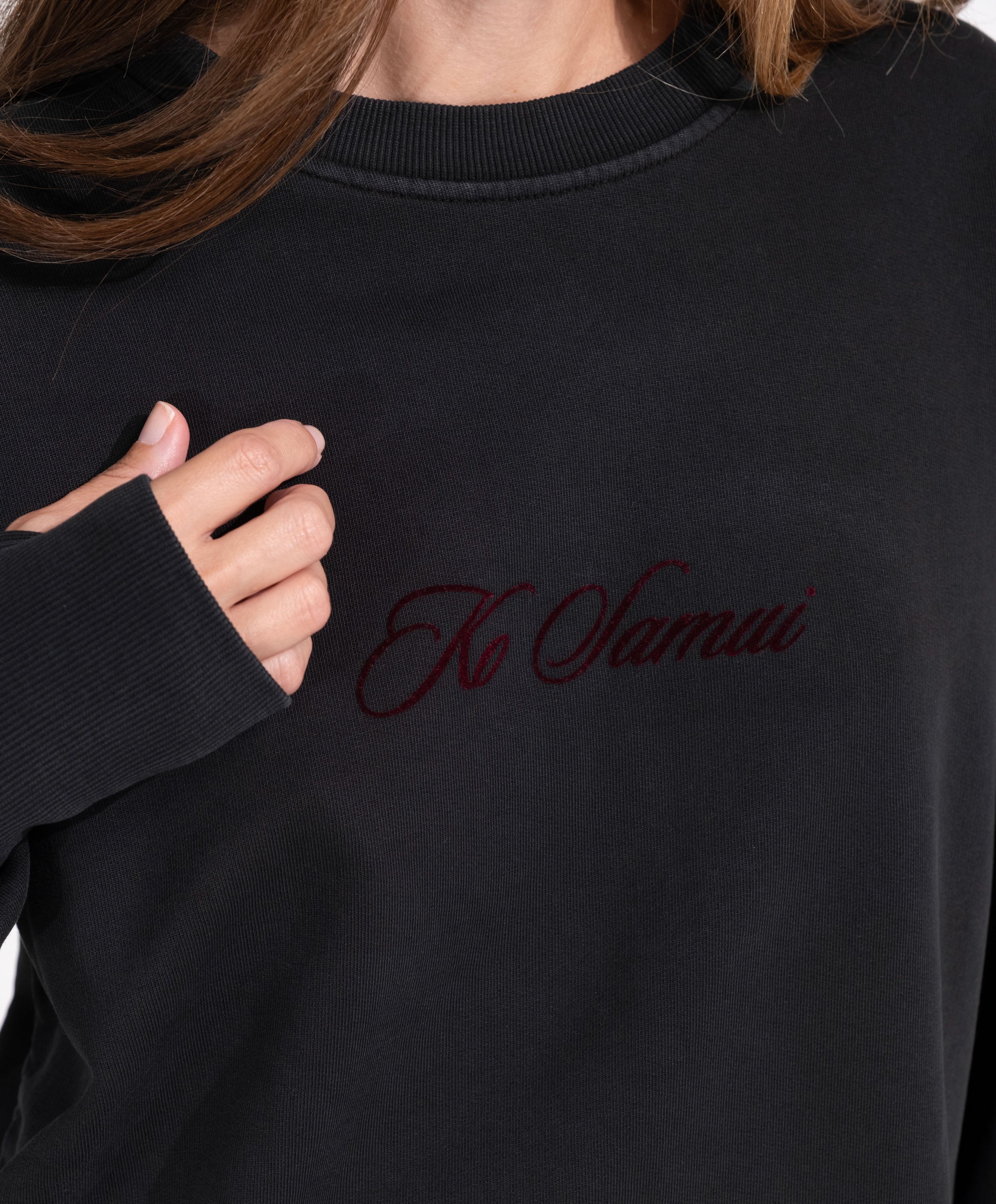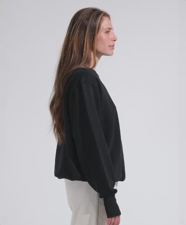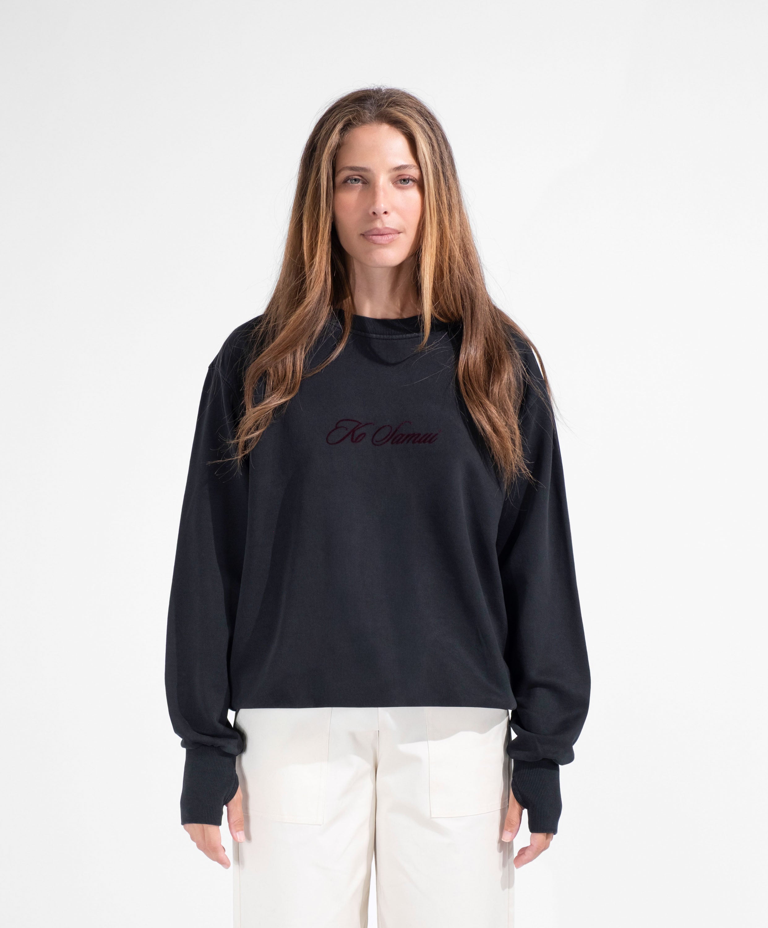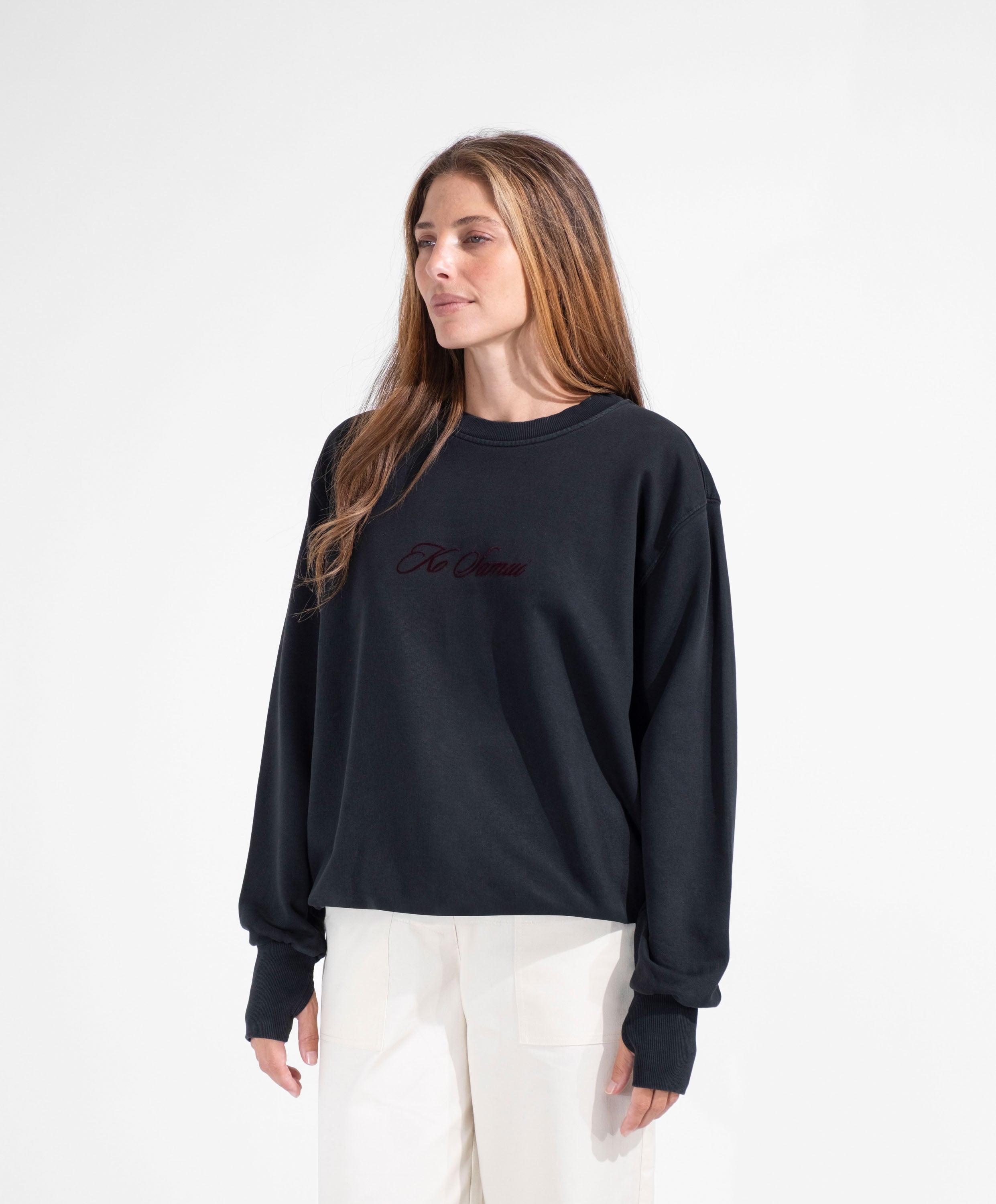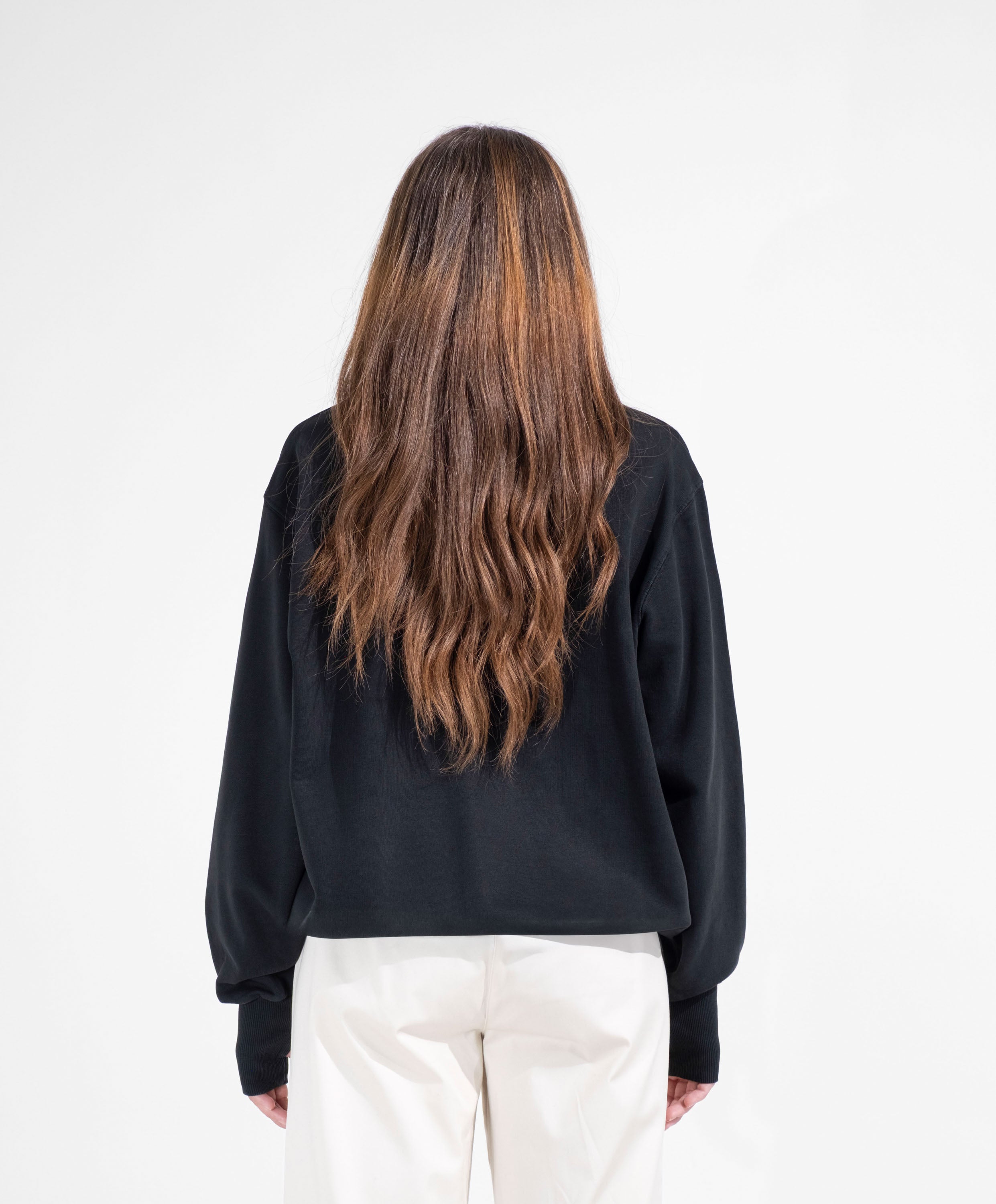 Felpa girocollo, tinto in capo, vestibilità over, polsini dotati di passapollice, 100% cotone French Terry 300 grammi. Peso medio consigliata per tutte le stagioni.