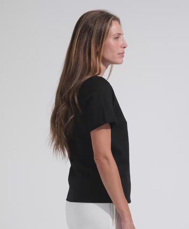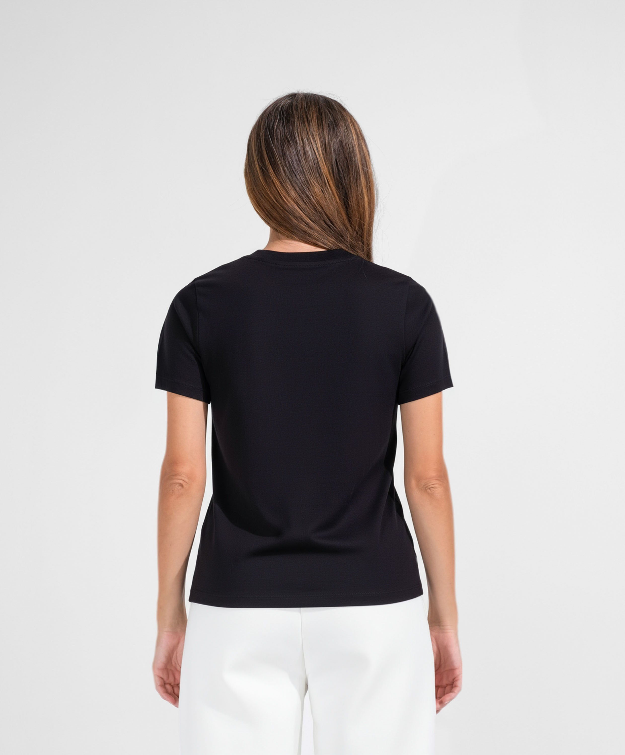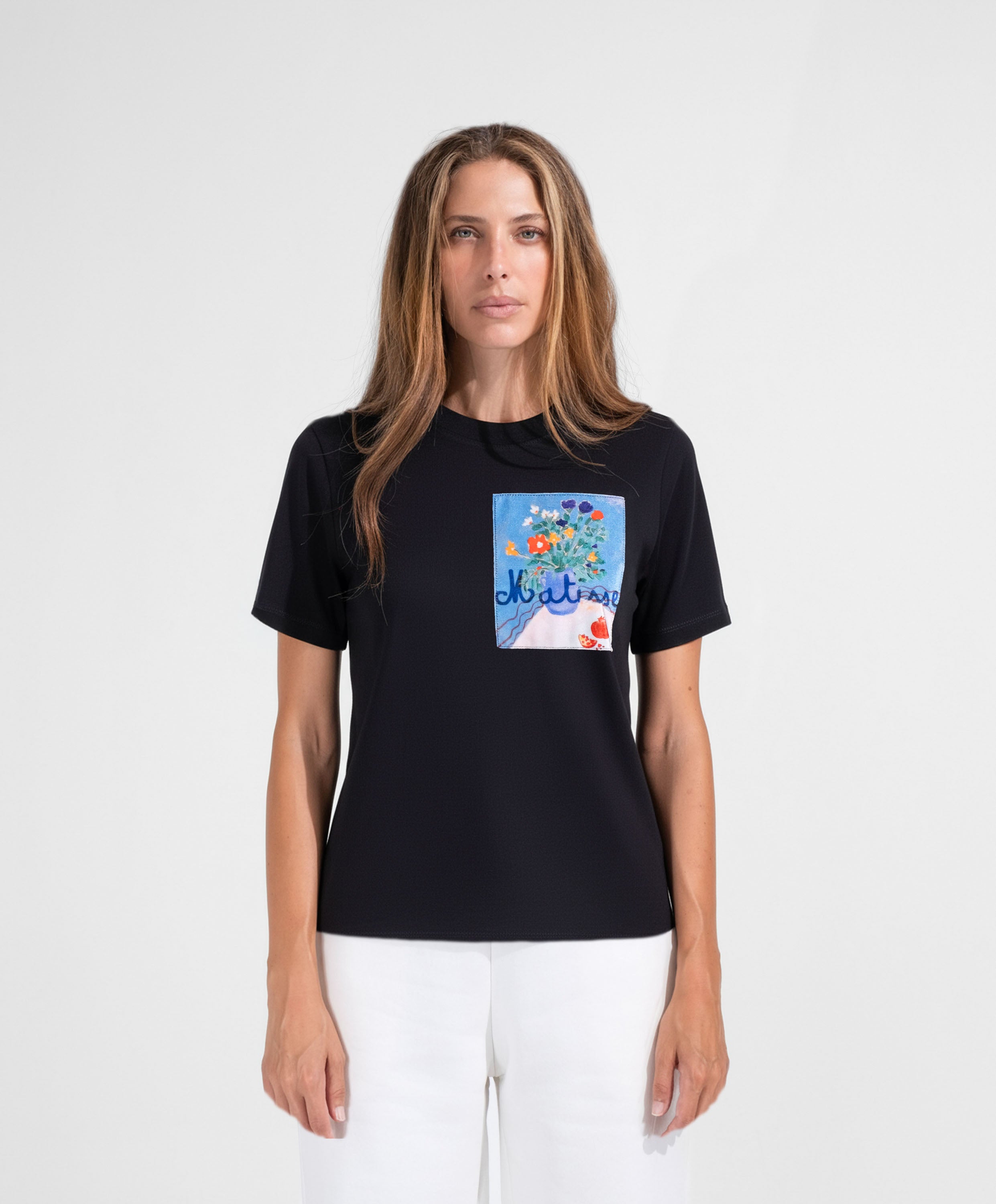 T-shirt donna, vestibilità over, collo alto a costine, 100% cotone ring spun 140gr, bandierina logo Ko Samui sul fianco.