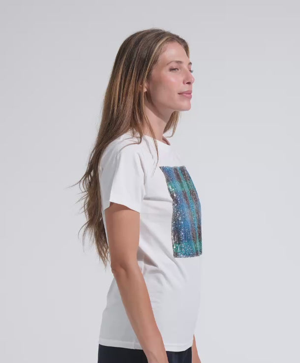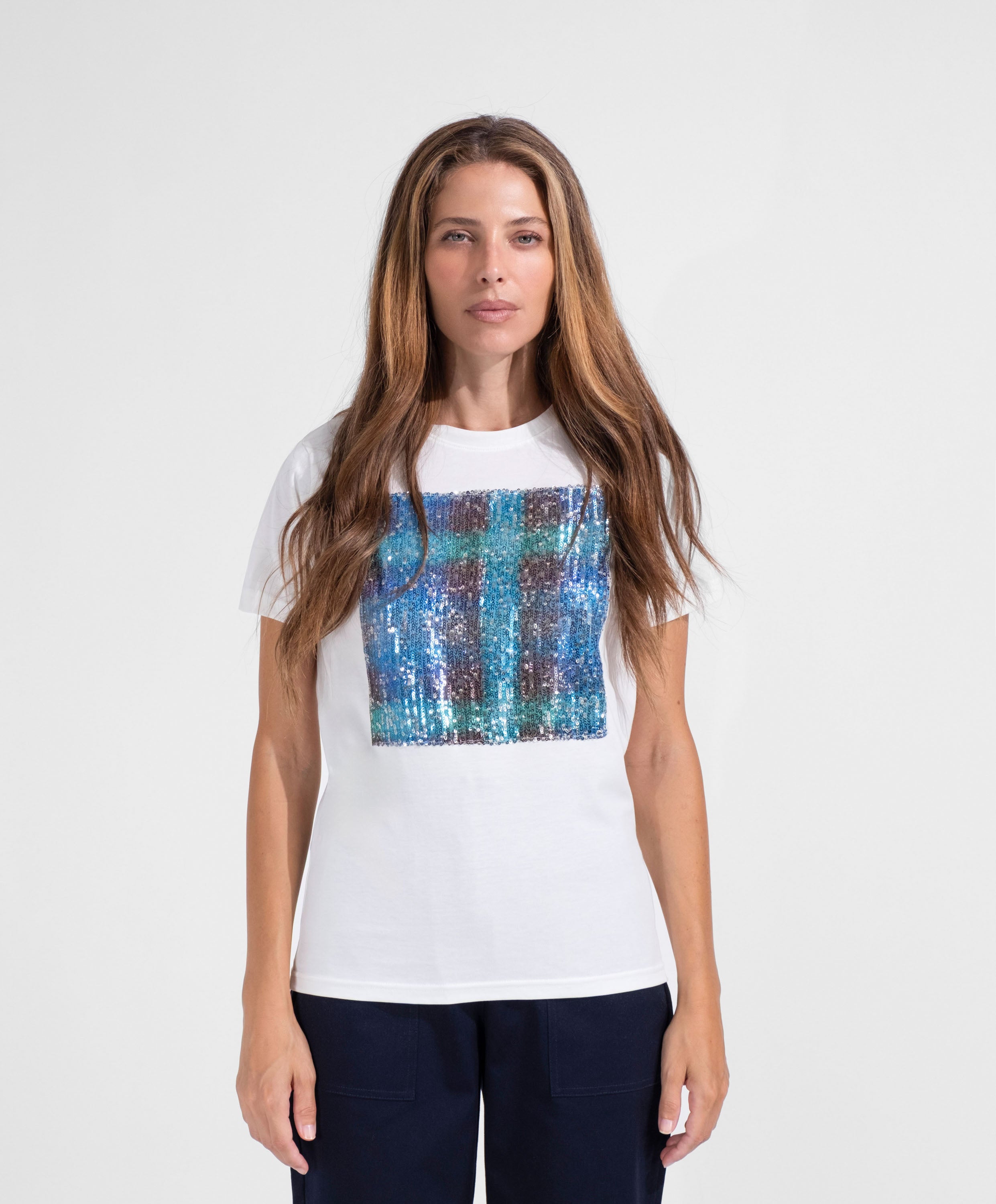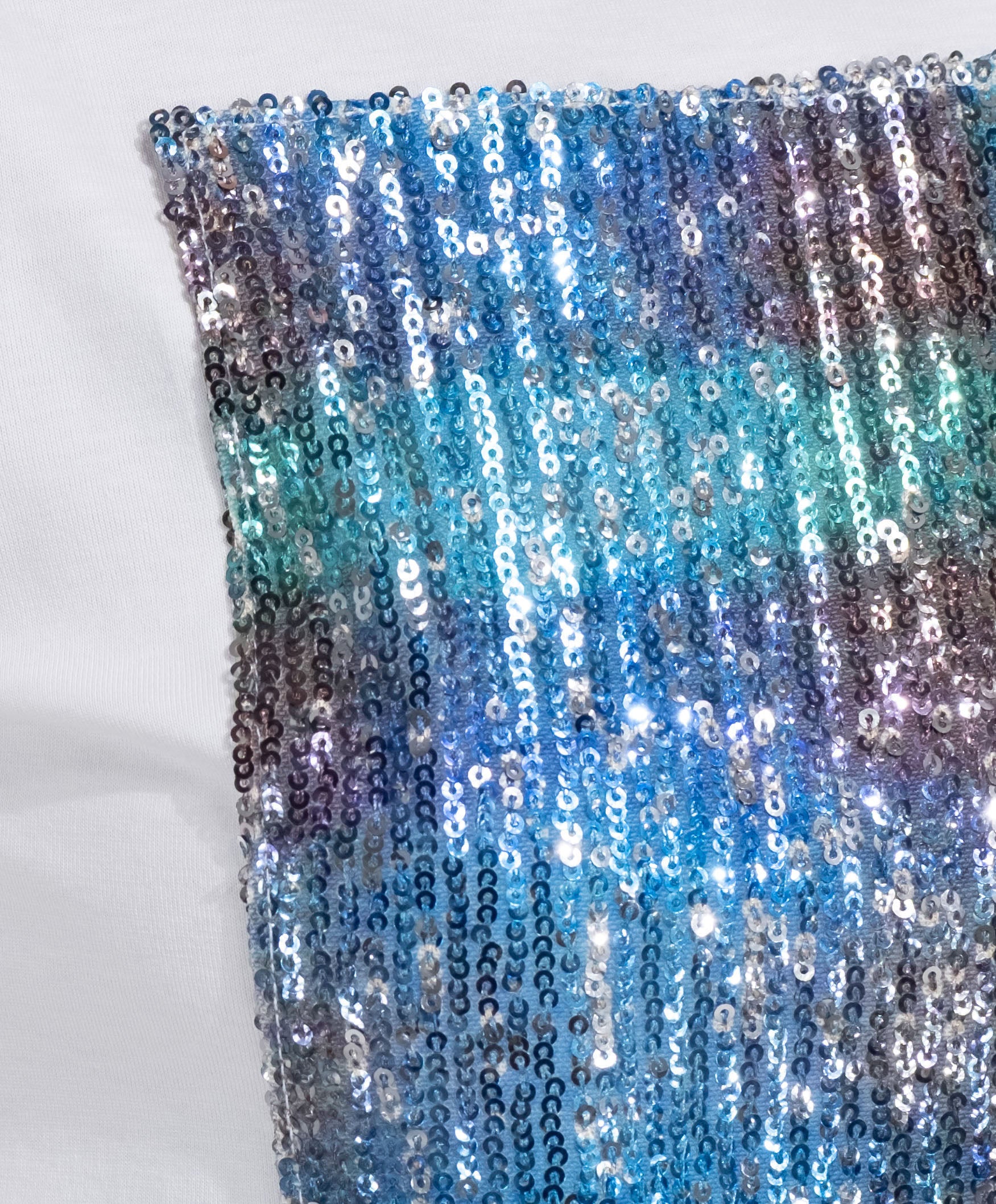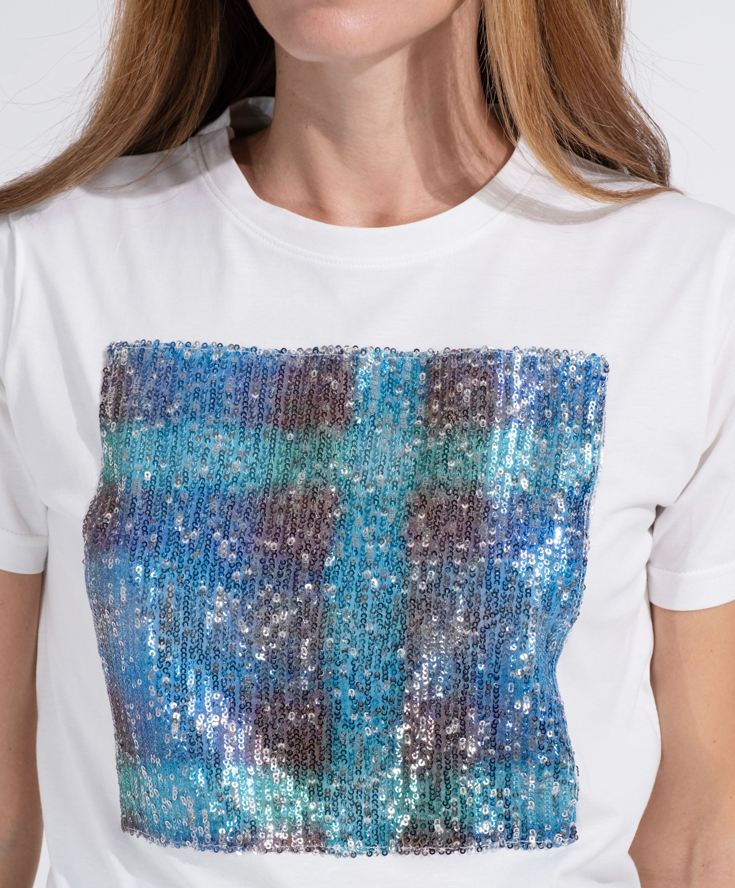 Stampa sublimatica su tessuto quadrato di pailettes cucita davanti, leggera e traspirante, impercettibile sulla pelle e resistente ai lavaggi.
