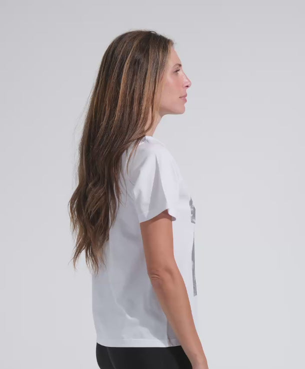 T-shirt donna, vestibilità over, collo alto a costine, 100% cotone ring spun 140gr, bandierina logo Ko Samui sul fianco.
