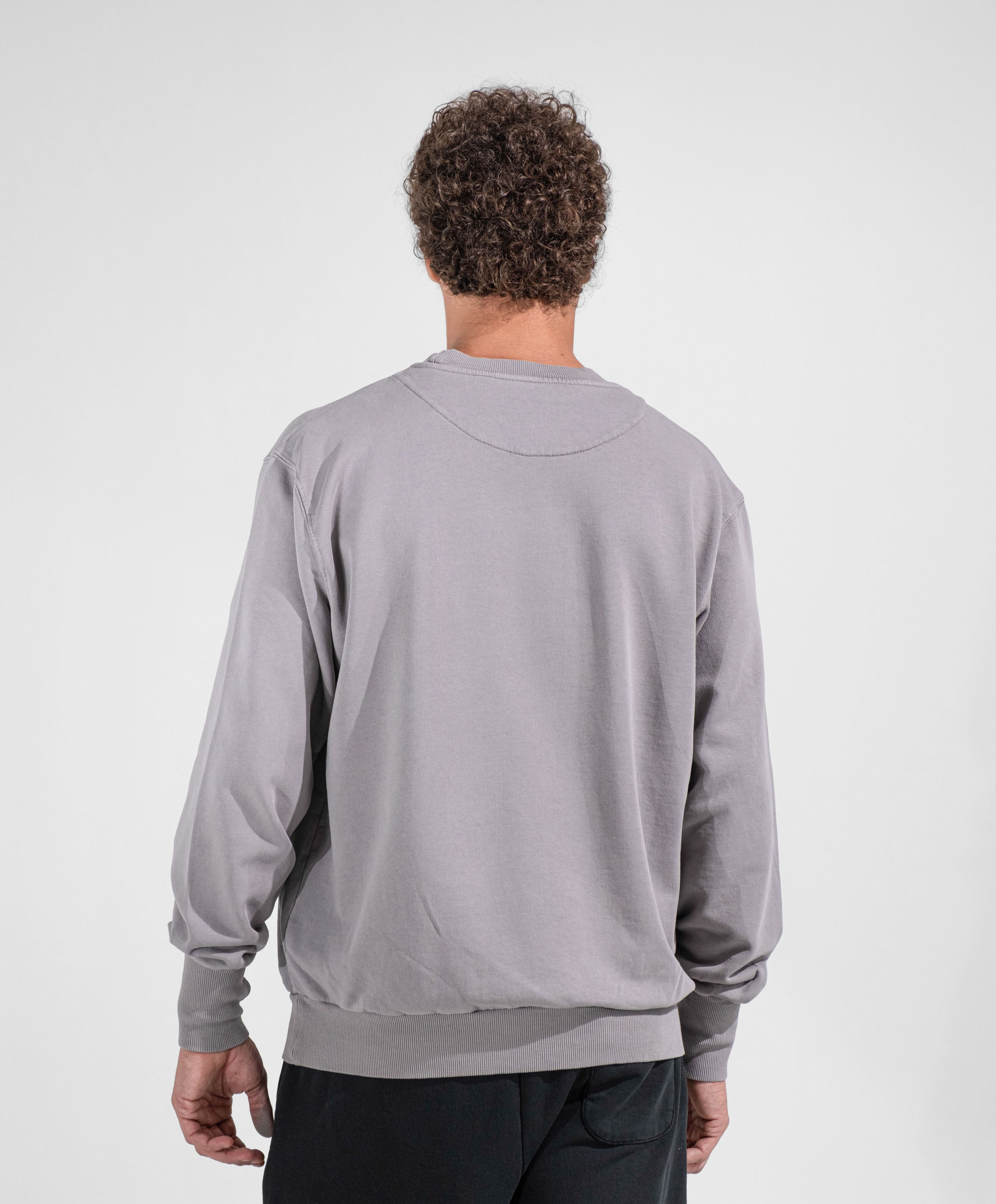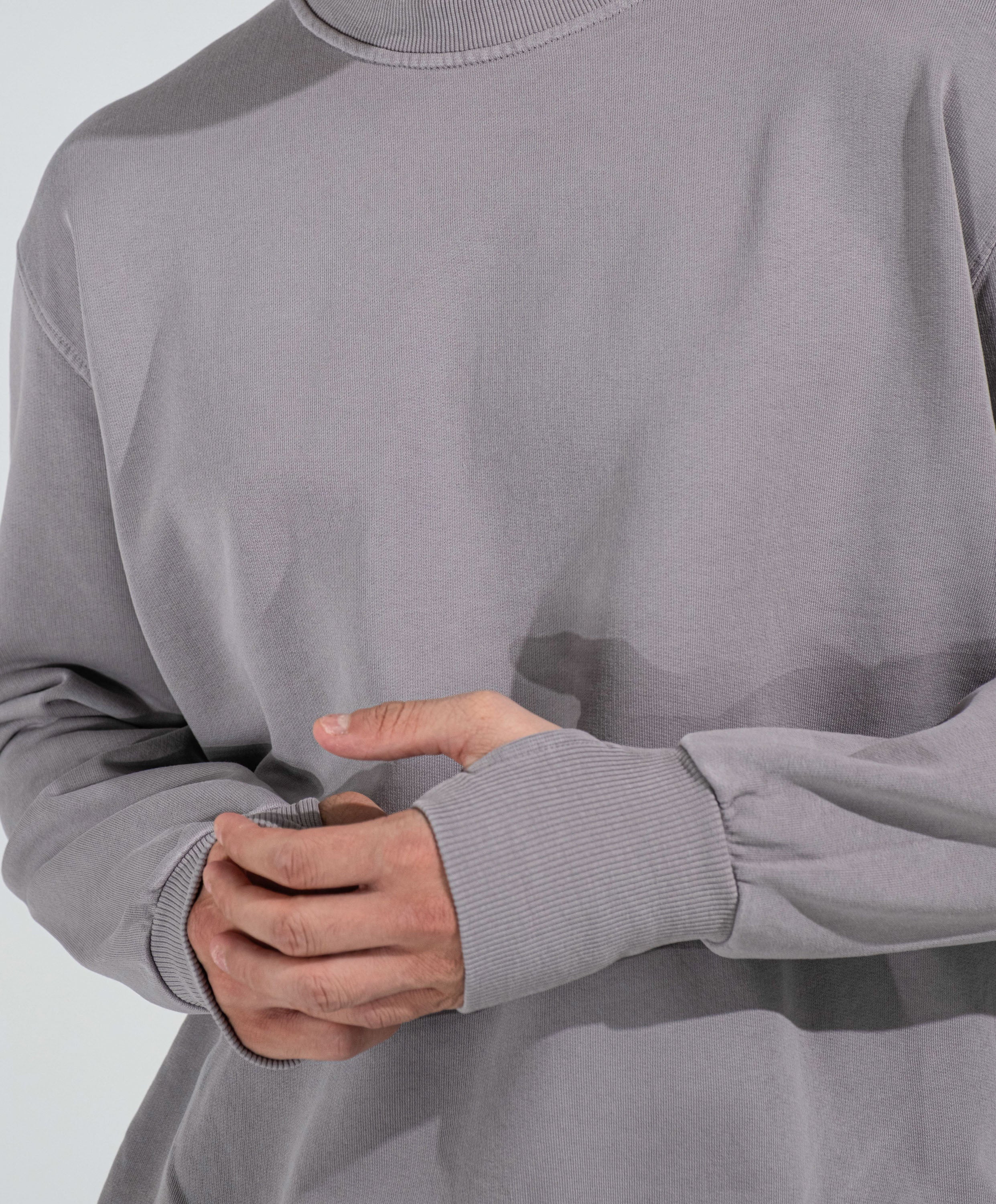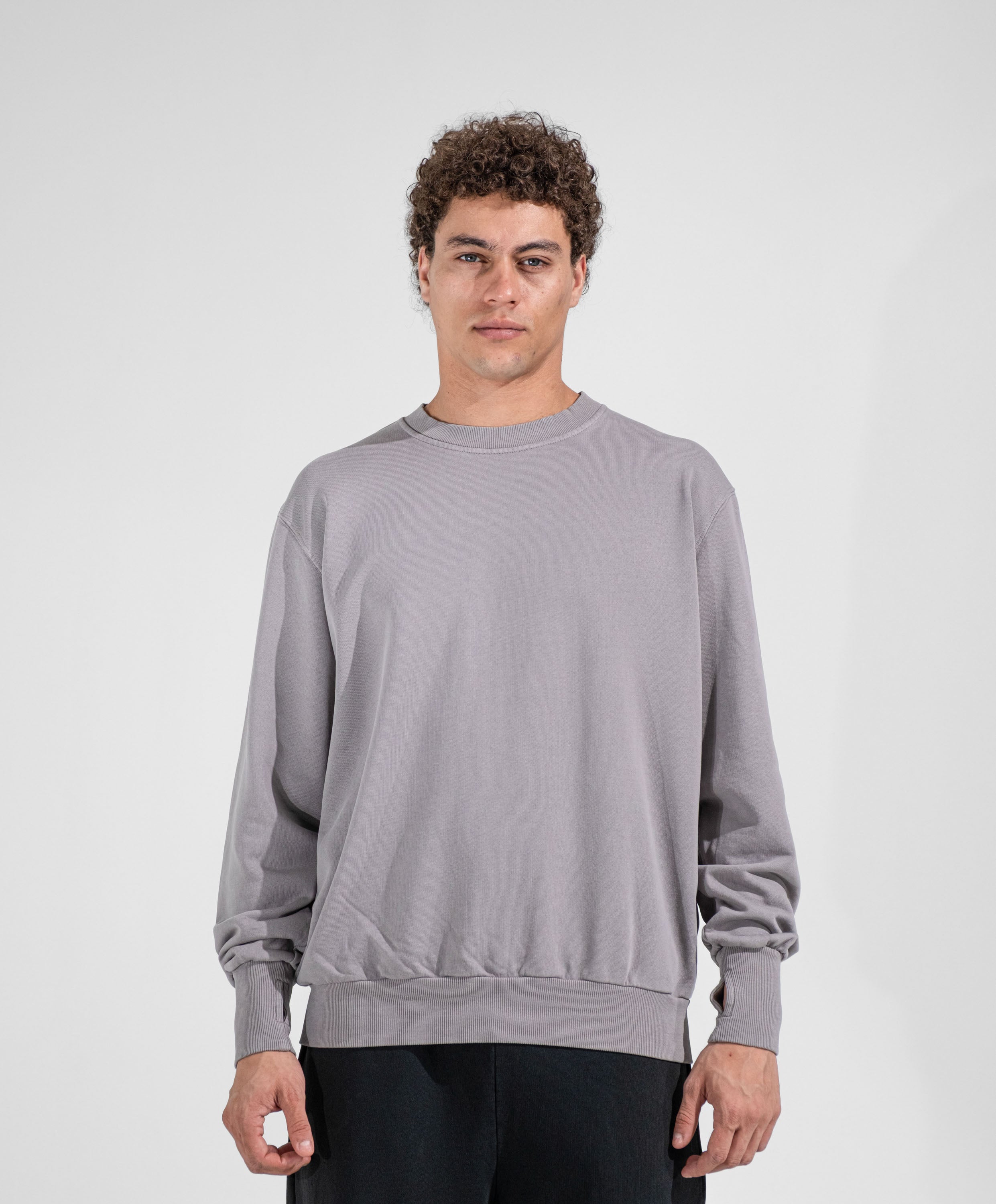 Crew neck sweatshirt, garment-dyed, oversized fit, cuffs with thumb loops, 100% 300-gram French Terry cotton. Medium weight, recommended for all seasons.