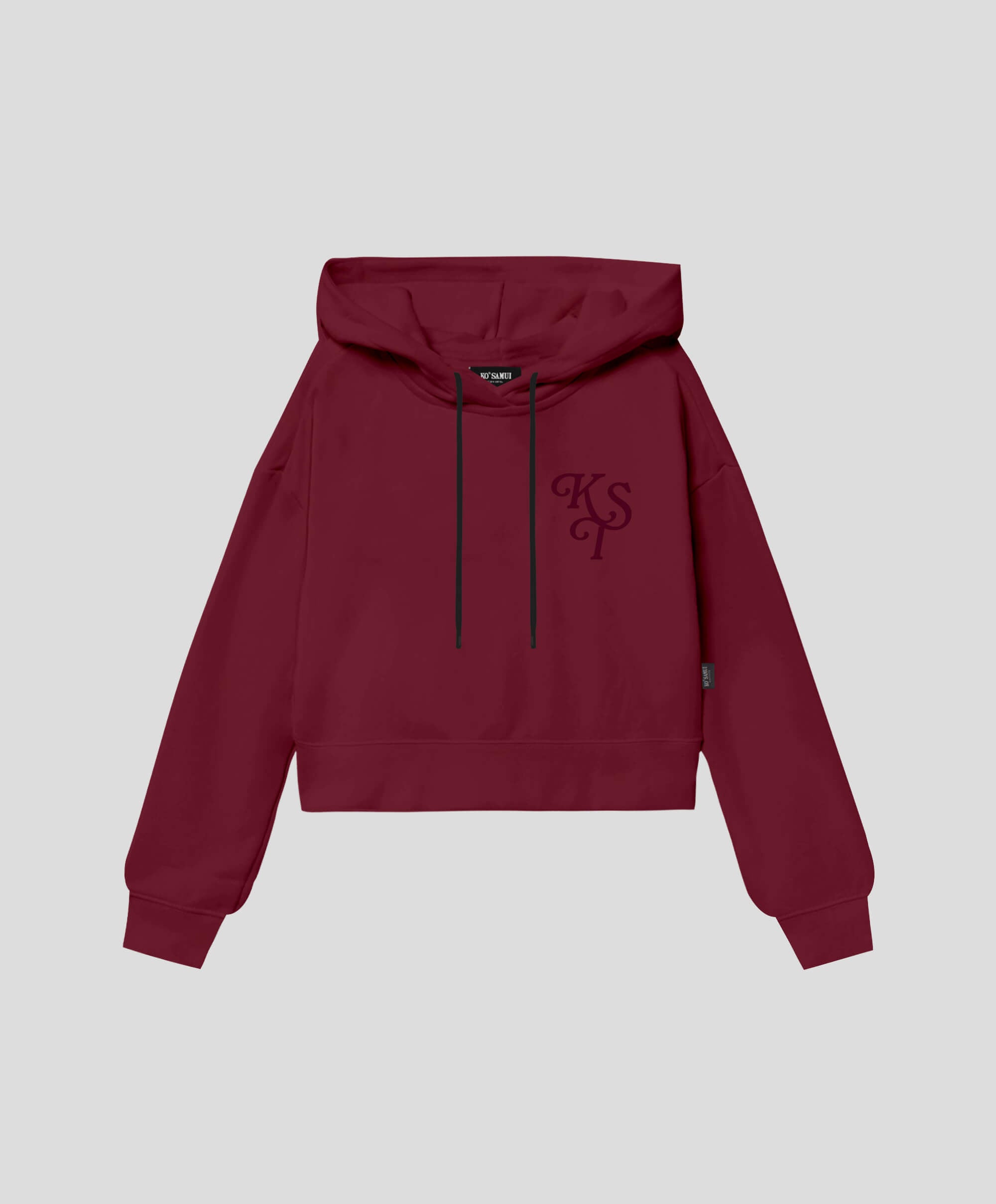 Estampado "KST" en terciopelo rojo burdeos termoadhesivo en el pecho, ligero y transpirable, imperceptible sobre la piel y resistente al lavado.
