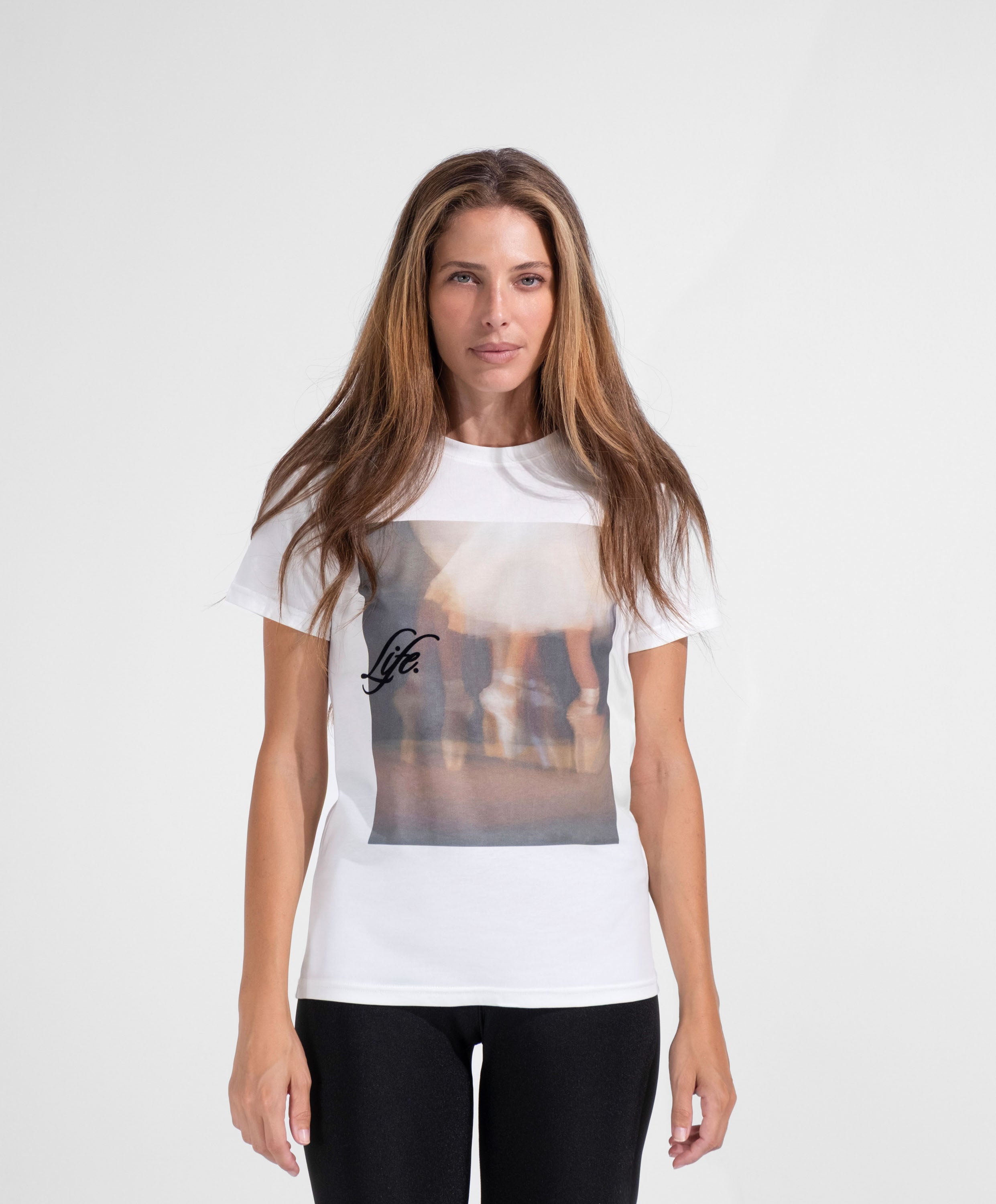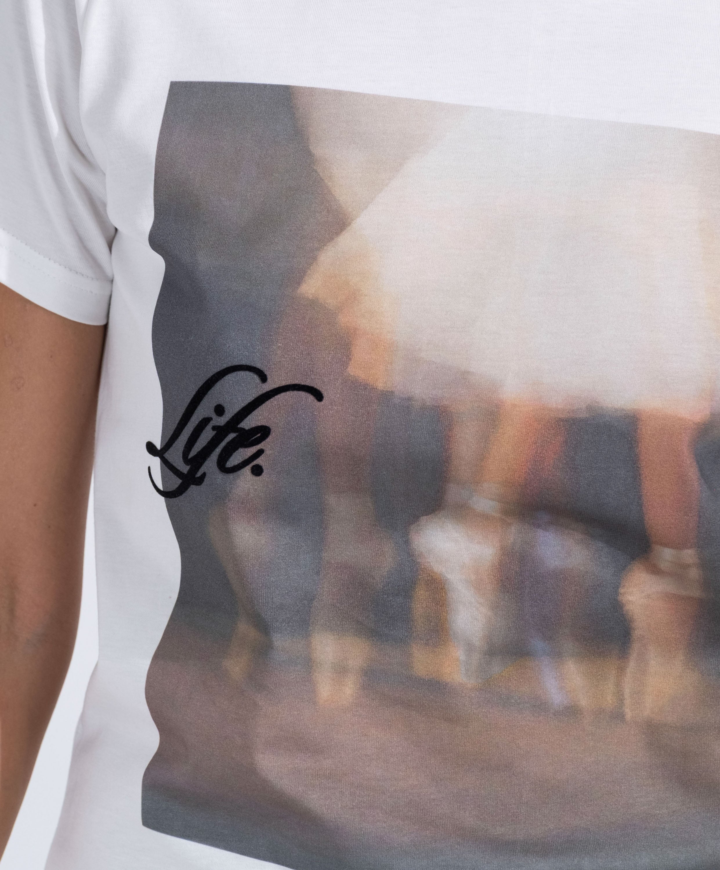 Stampa digitale a colori ad alta definizione davanti e transfer "life" in velluto nero termo-applicato sopra, leggera e traspirante, impercettibile sulla pelle e resistente ai lavaggi.